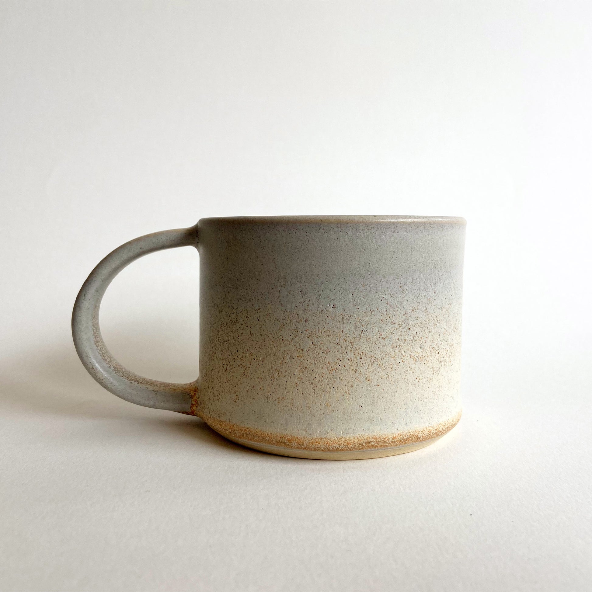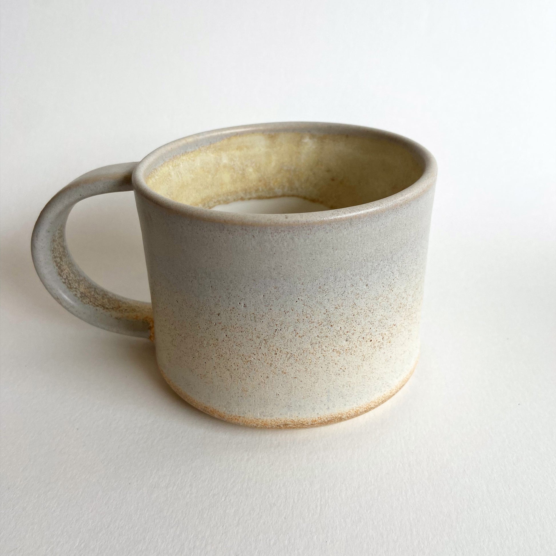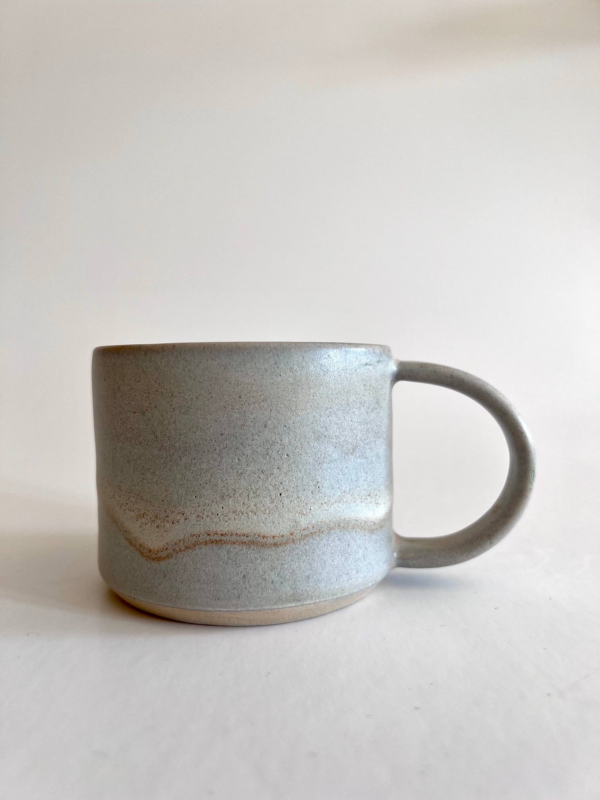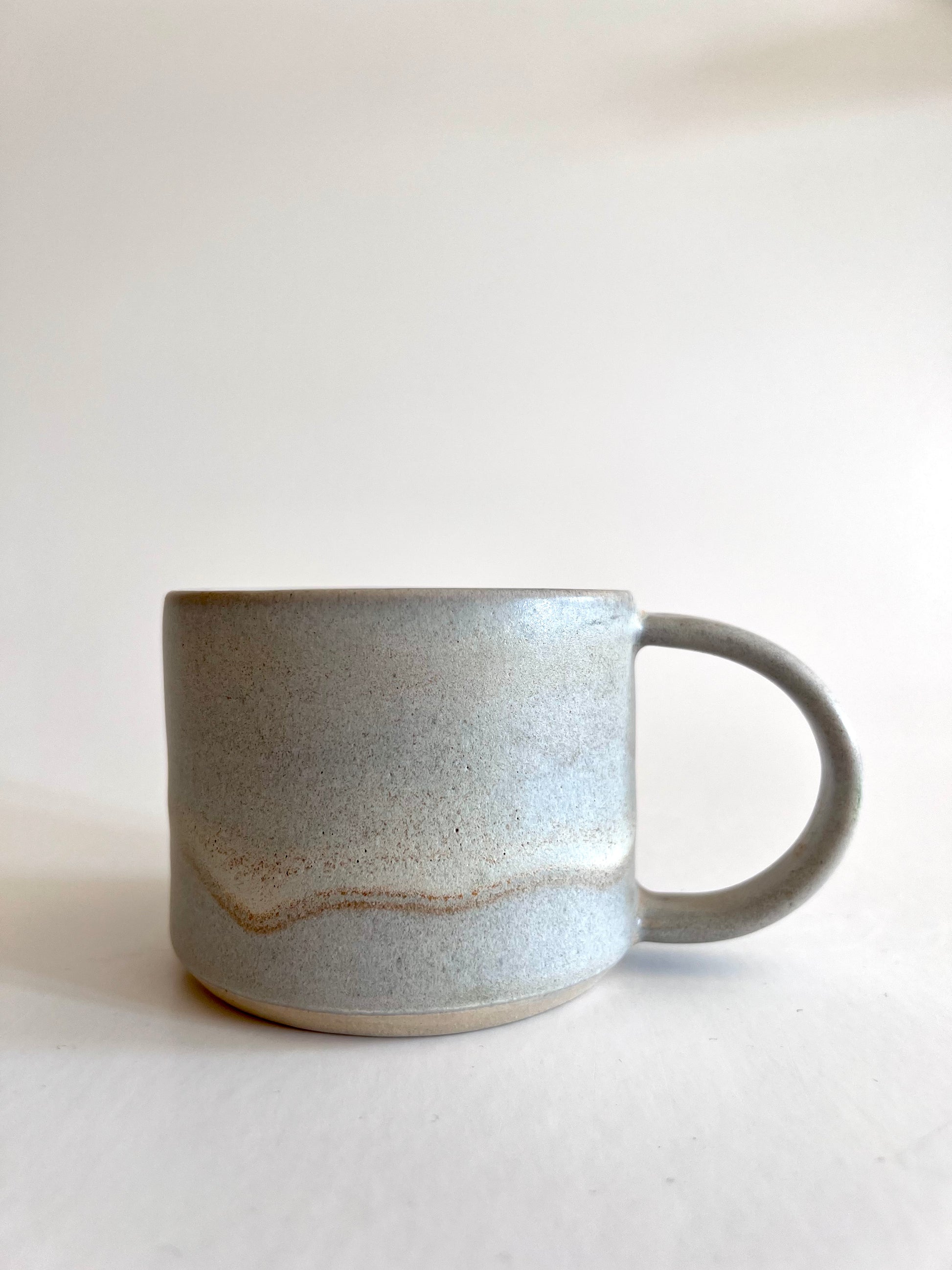 En smuk håndlavet kop med hank i et minimalistisk design som passer smukt i de fleste hjem. Koppen er lavet i stentøj og tåler opvaskemaskine. Farven er sart grå med varme undertoner.