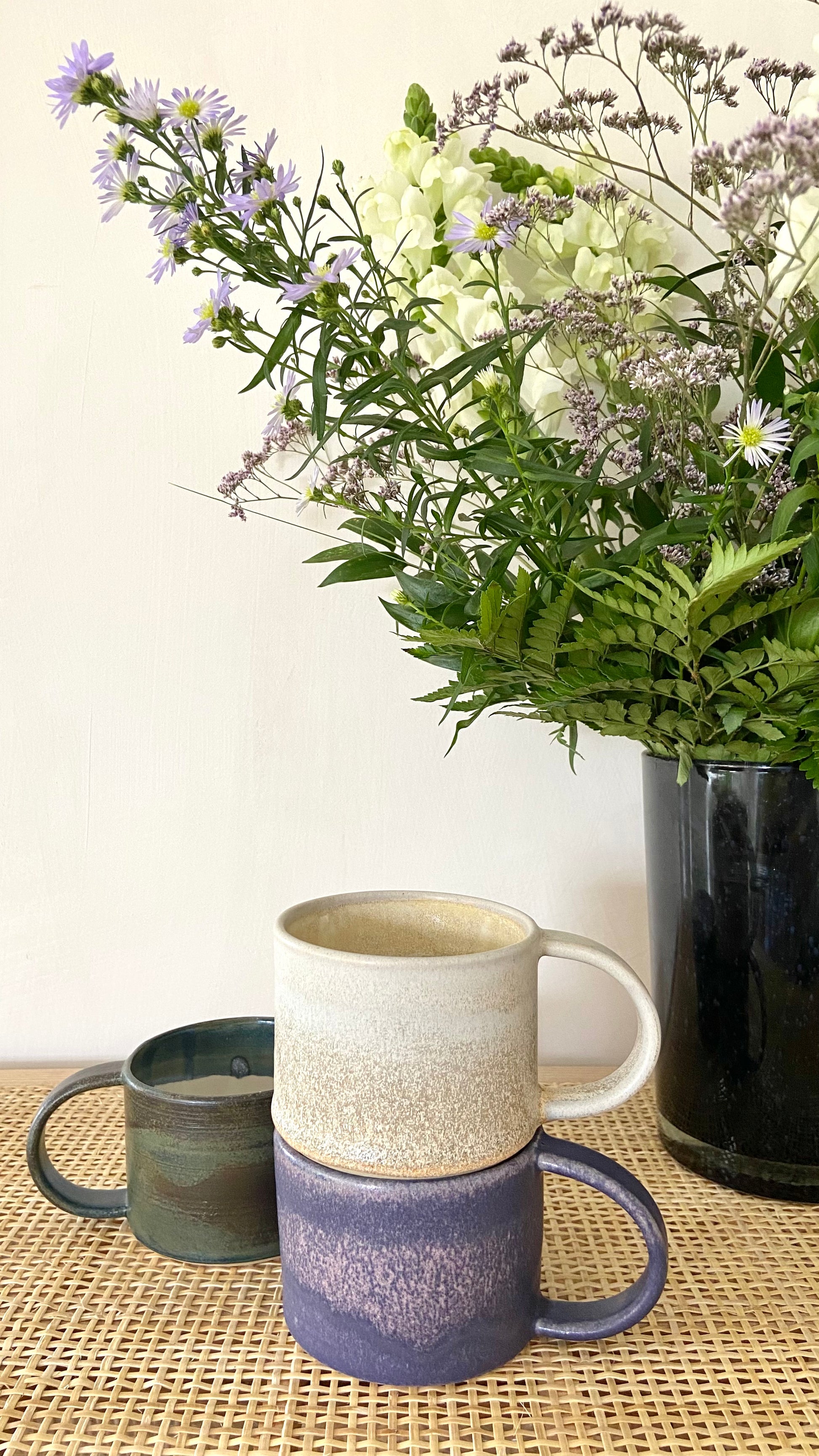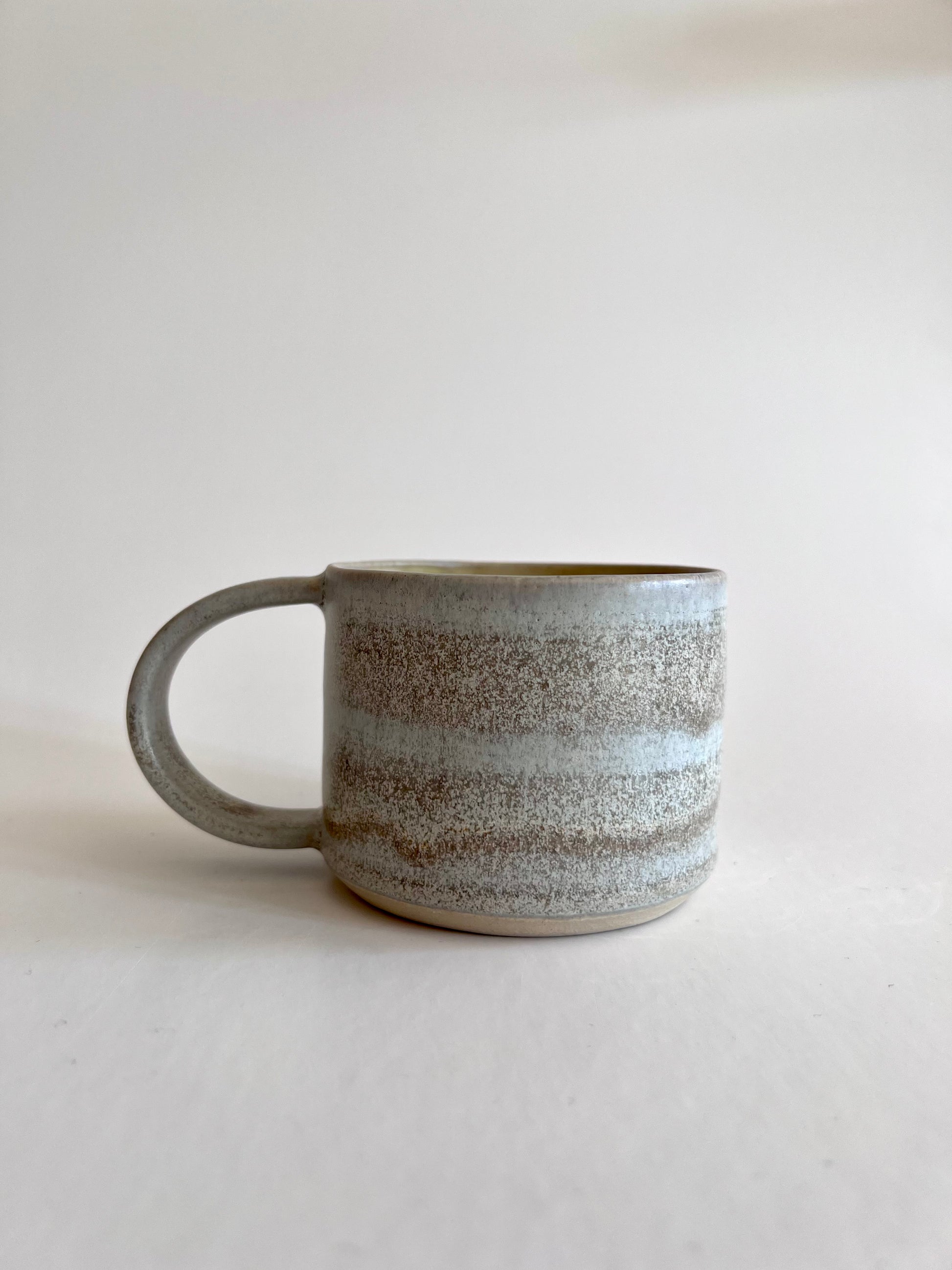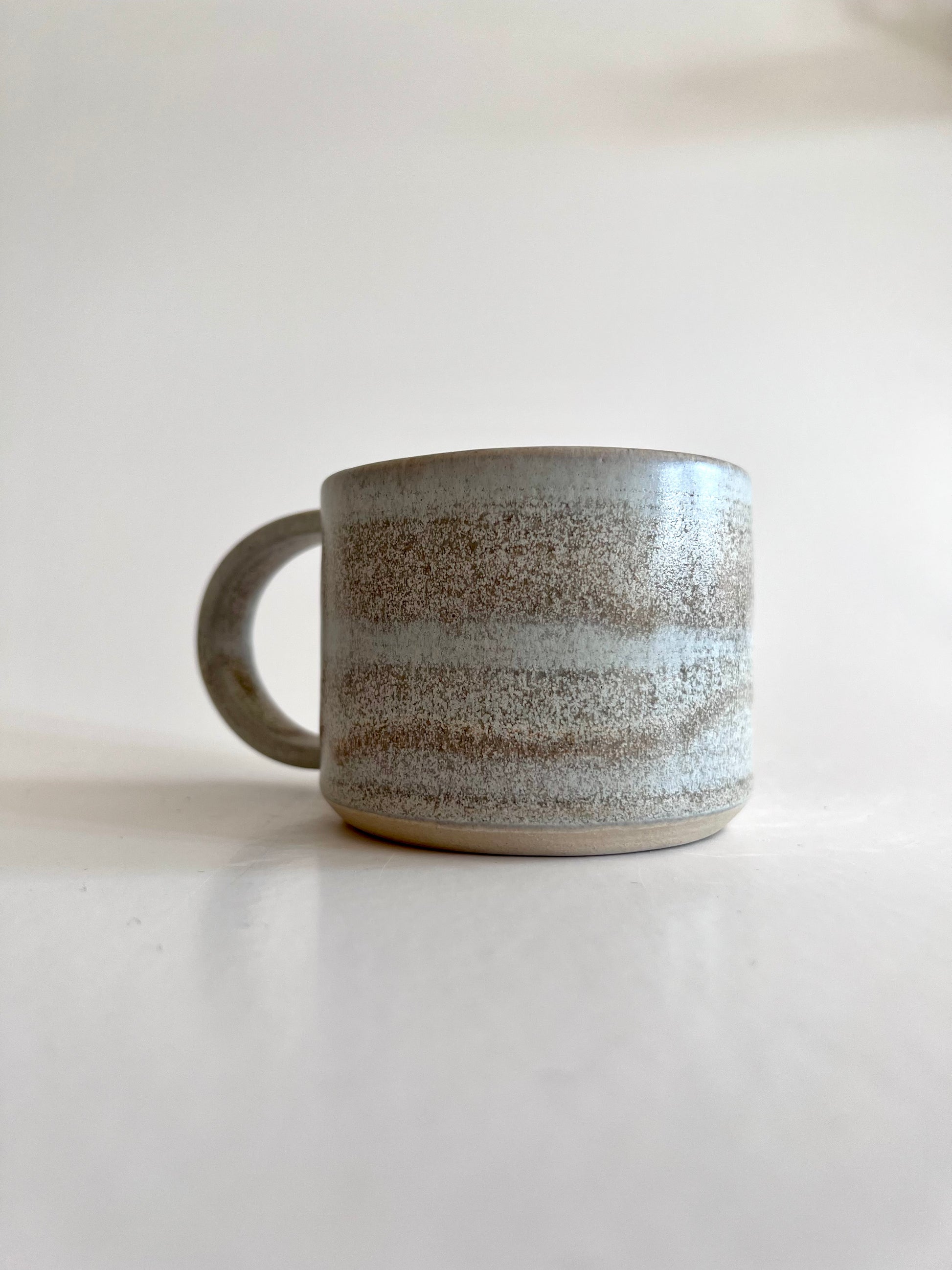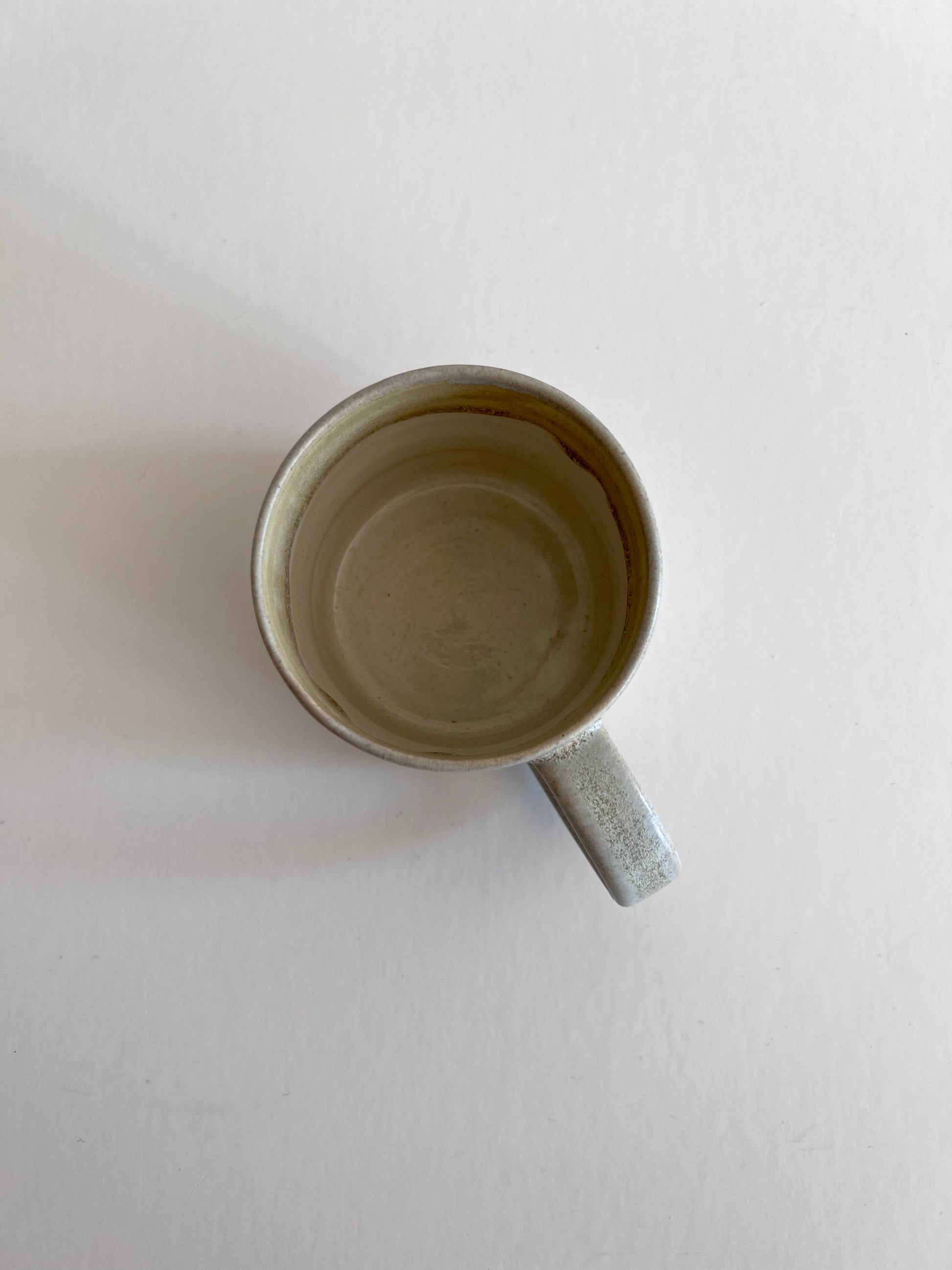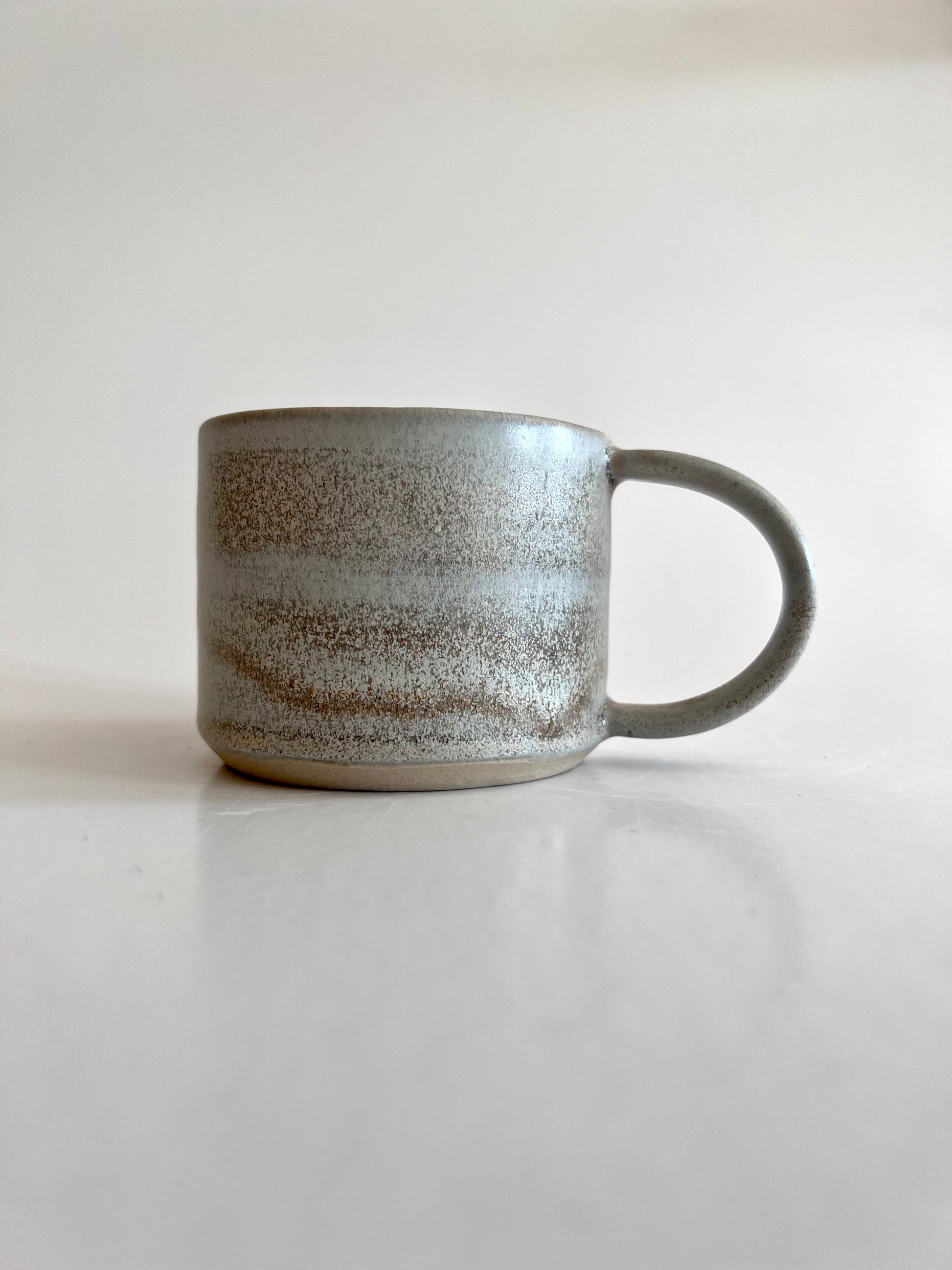 En smuk håndlavet kop med hank i et minimalistisk design som passer smukt i de fleste hjem. Koppen er lavet i stentøj og tåler opvaskemaskine. Farven er sart grå med varme undertoner.