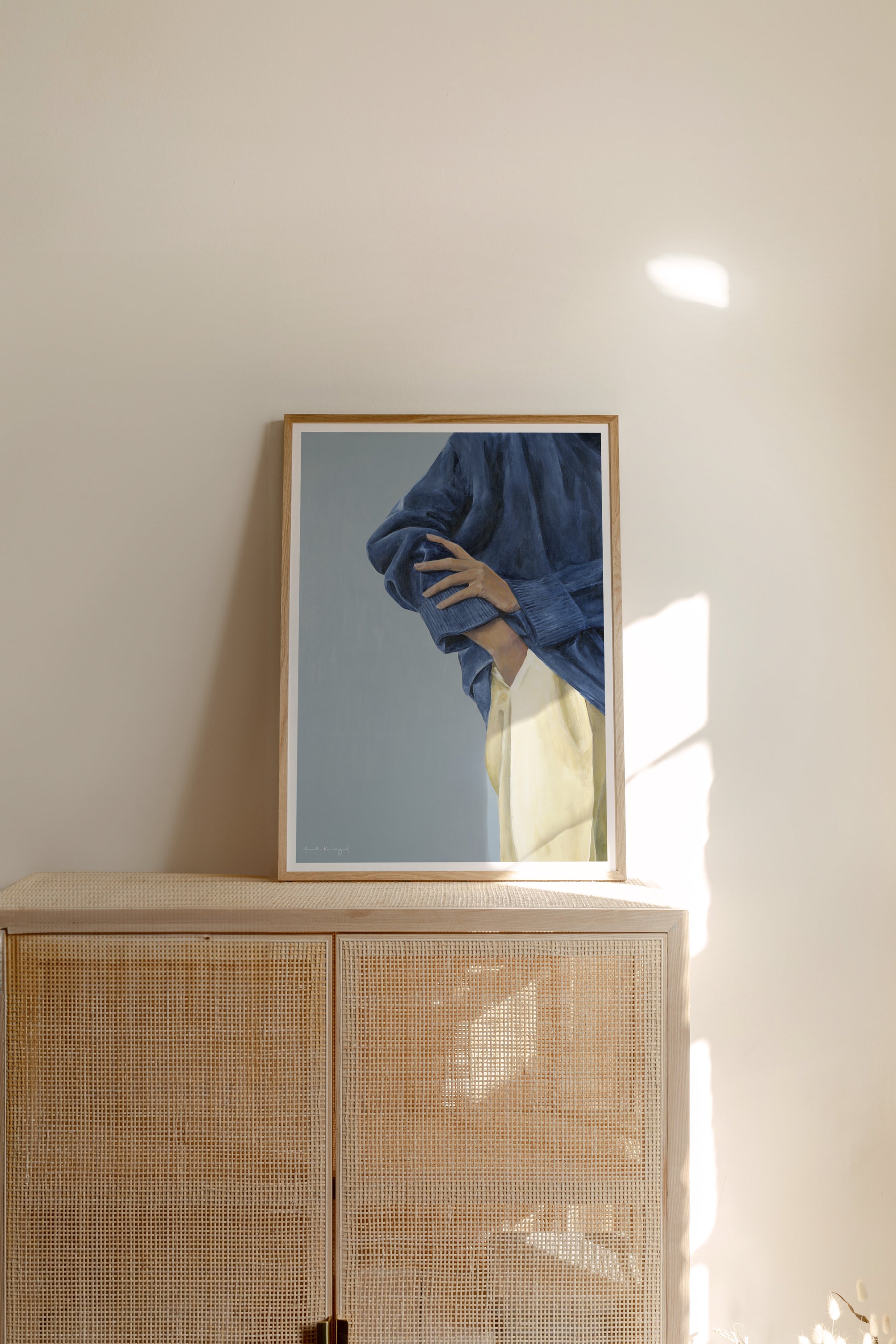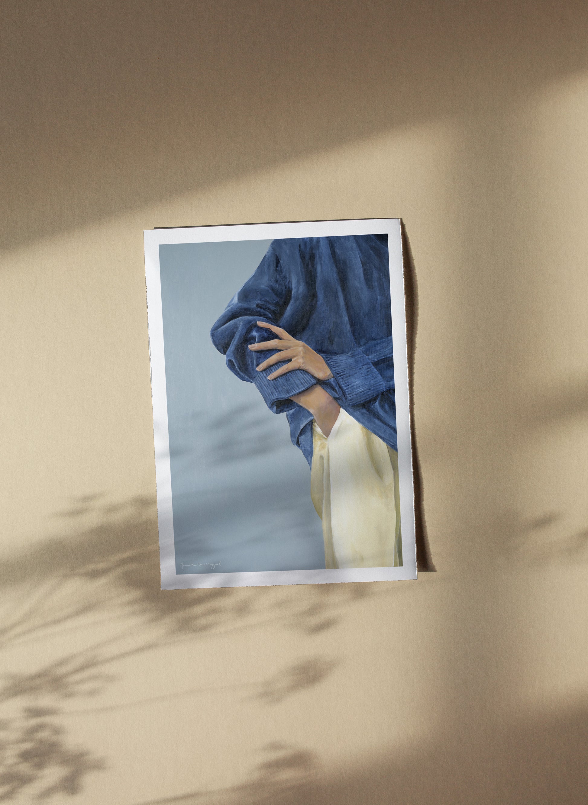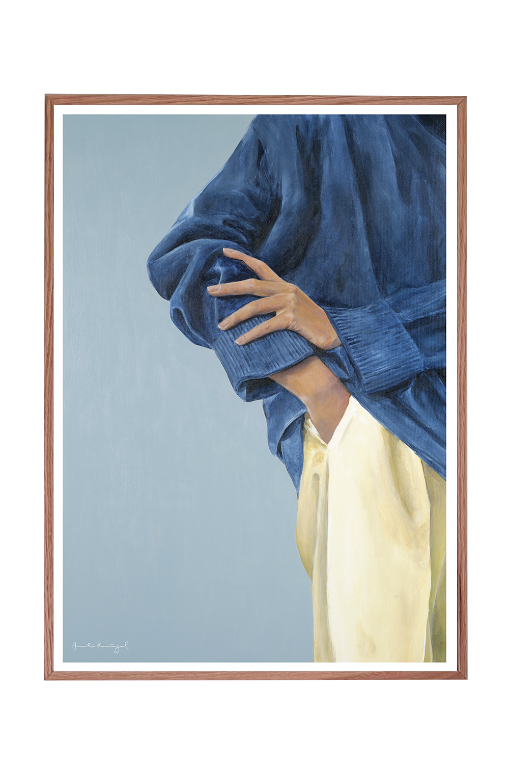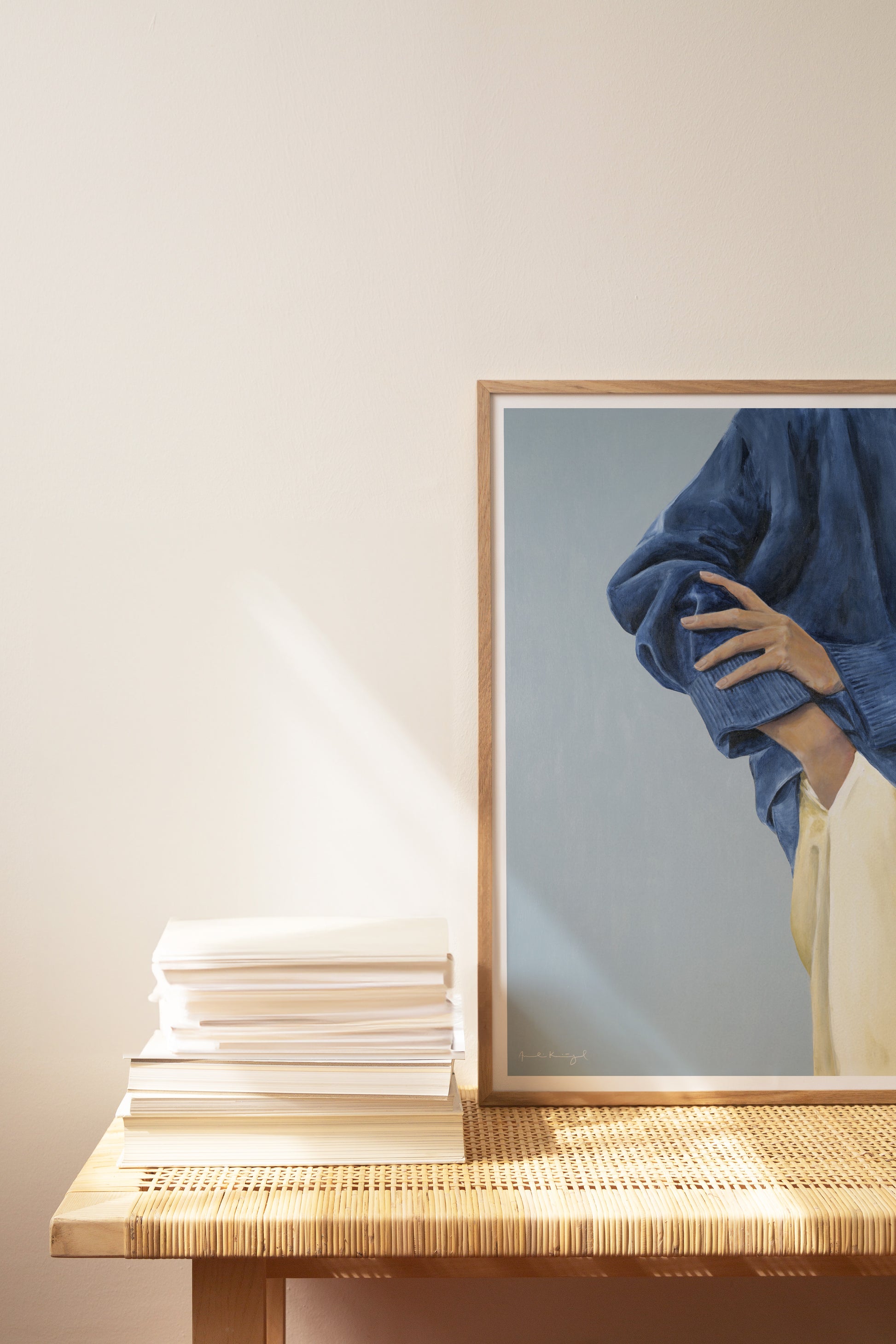 I blåt er malet primært med ultramarineblå og okker, som sammen skaber en vifte af harmoniske toner der giver farverne en sammenhængskraft. Jeg har arbejdet med det tomme rum som en præmis og ladet detaljegraden varierer og give plads. Det rolige udtryk gør det muligt at lege med motivet i indretningen, da det både fungerer i samspil med andre kunstværker og alene.
