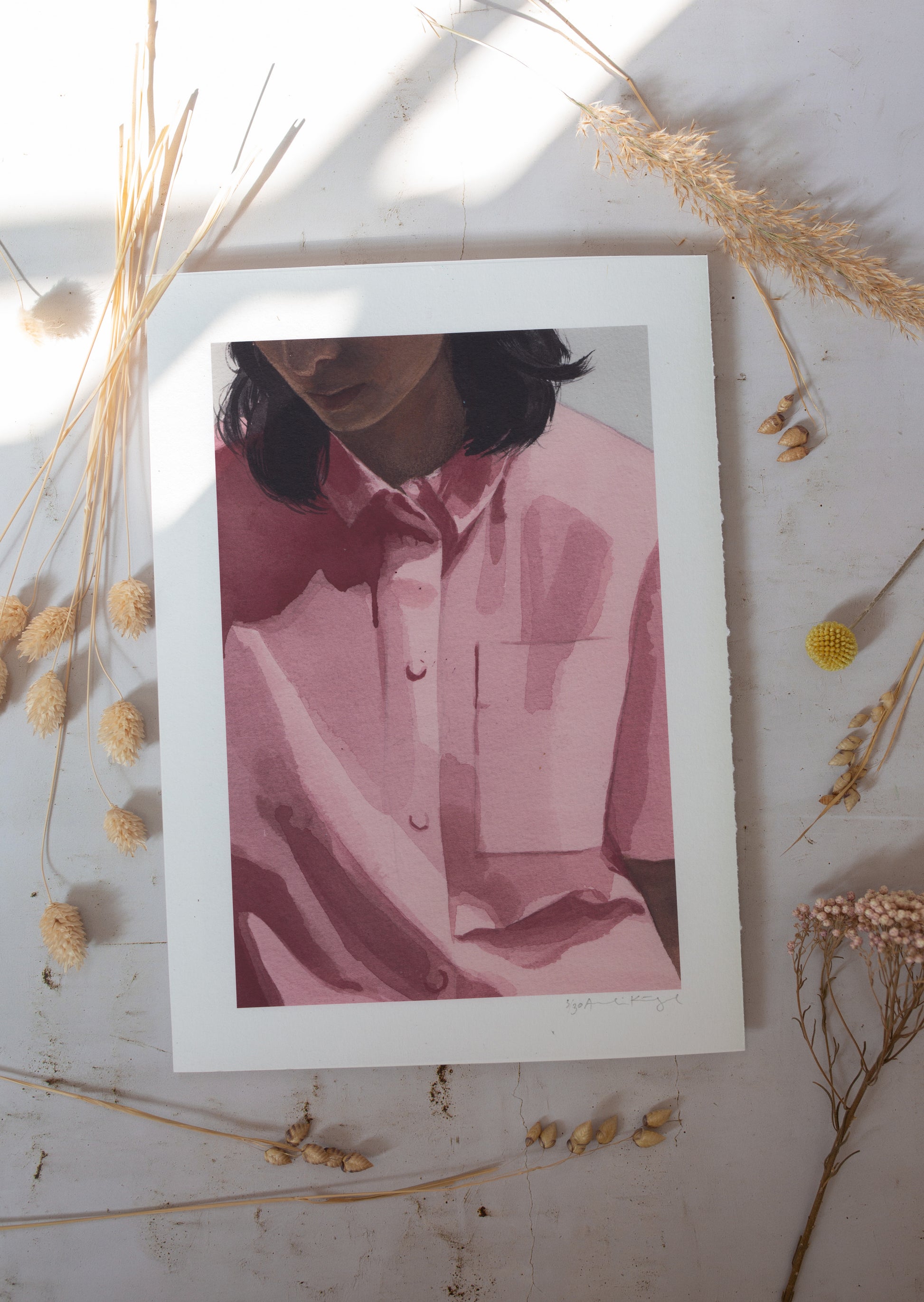 I lyserødt er trykt i et begrænset antal på 30 som er nummereret og signeret. De er trykt på 265 grams Hahnemühle papir af 100% bomuld. Det giver en fuldstændig farvemættet smuk og mat overflade som ikke falmer.