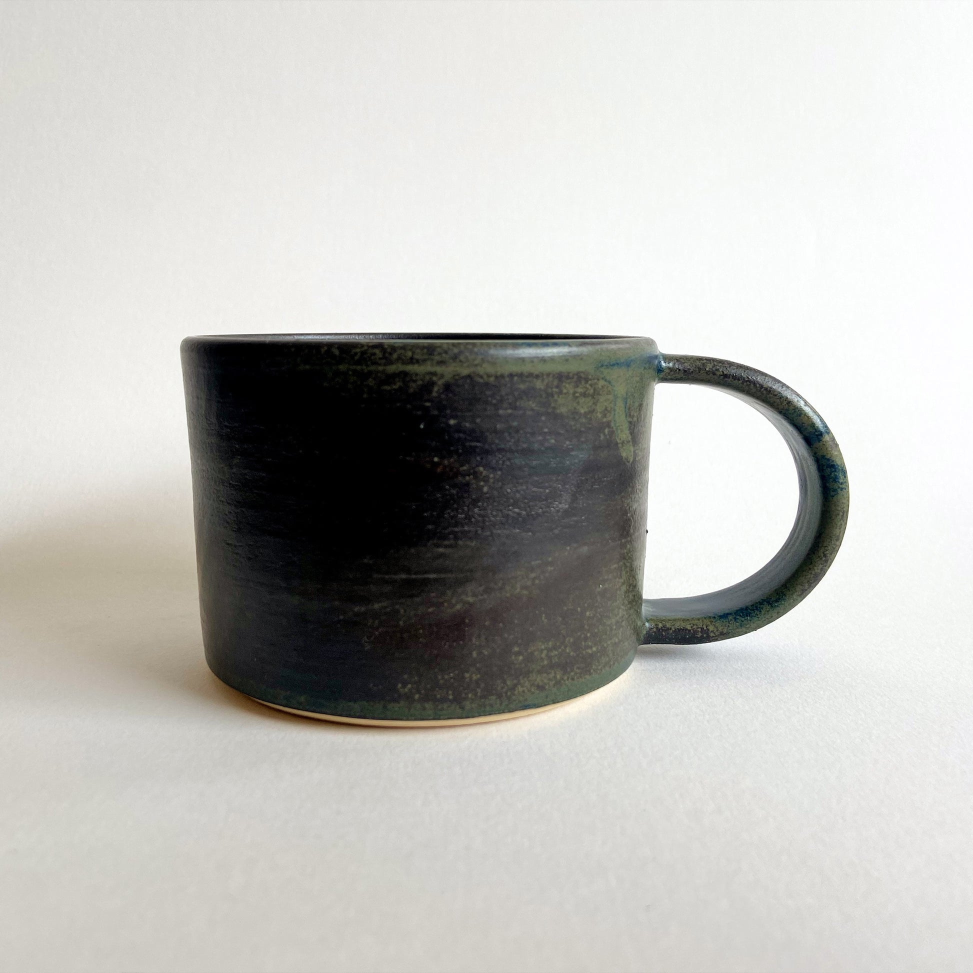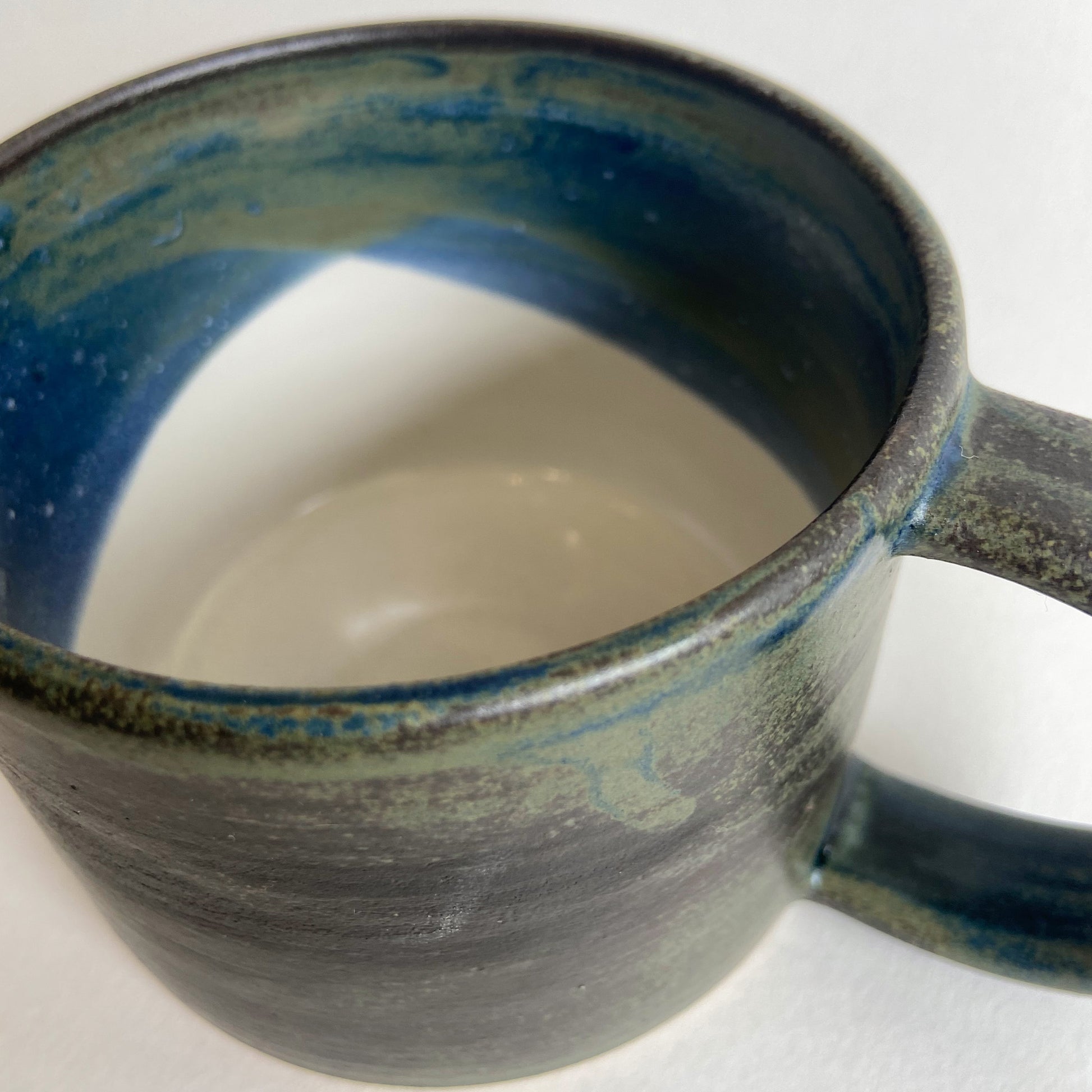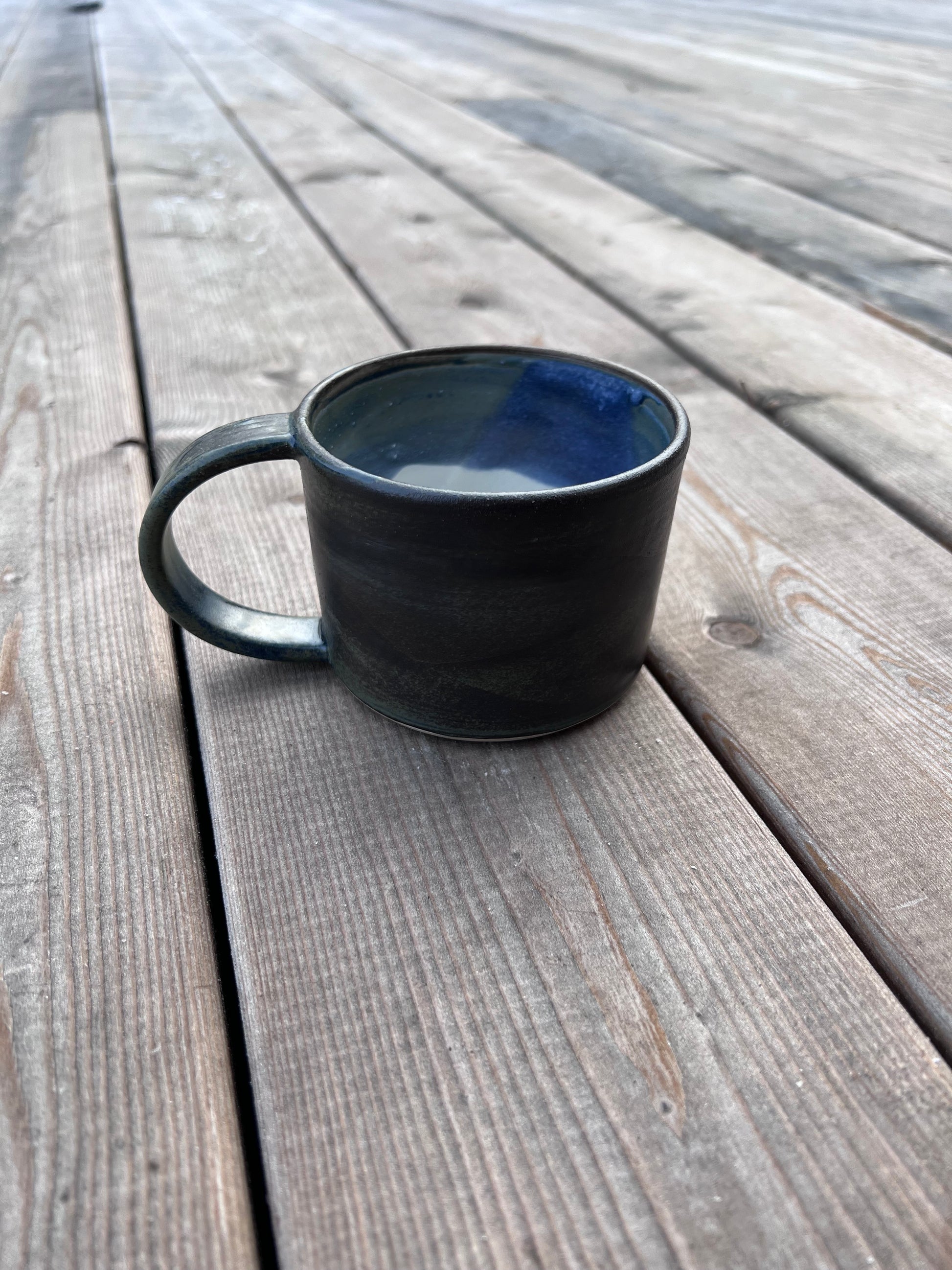 En smuk håndlavet kop med hank i et minimalistisk design som passer smukt i de fleste hjem. Koppen er lavet i stentøj og tåler opvaskemaskine. Koppen har en mørke overflade som varierer fra blå til grøn i dybe mørke nuancer.